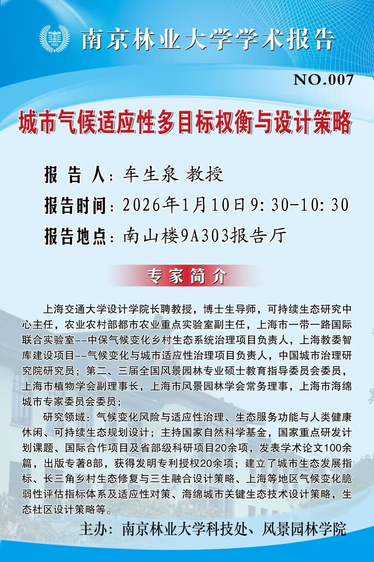 活动预告 首页 -活动预告 城市气候适应性多目标权衡与设计策略 来源:通讯员:摄影:【报告人】车生泉 教授 【报告时间】2026年1月10日9:30-10:30 【报告地点】南山楼9A303报告厅编辑:浏览:时间:2026-01-12 字号:【大中小】