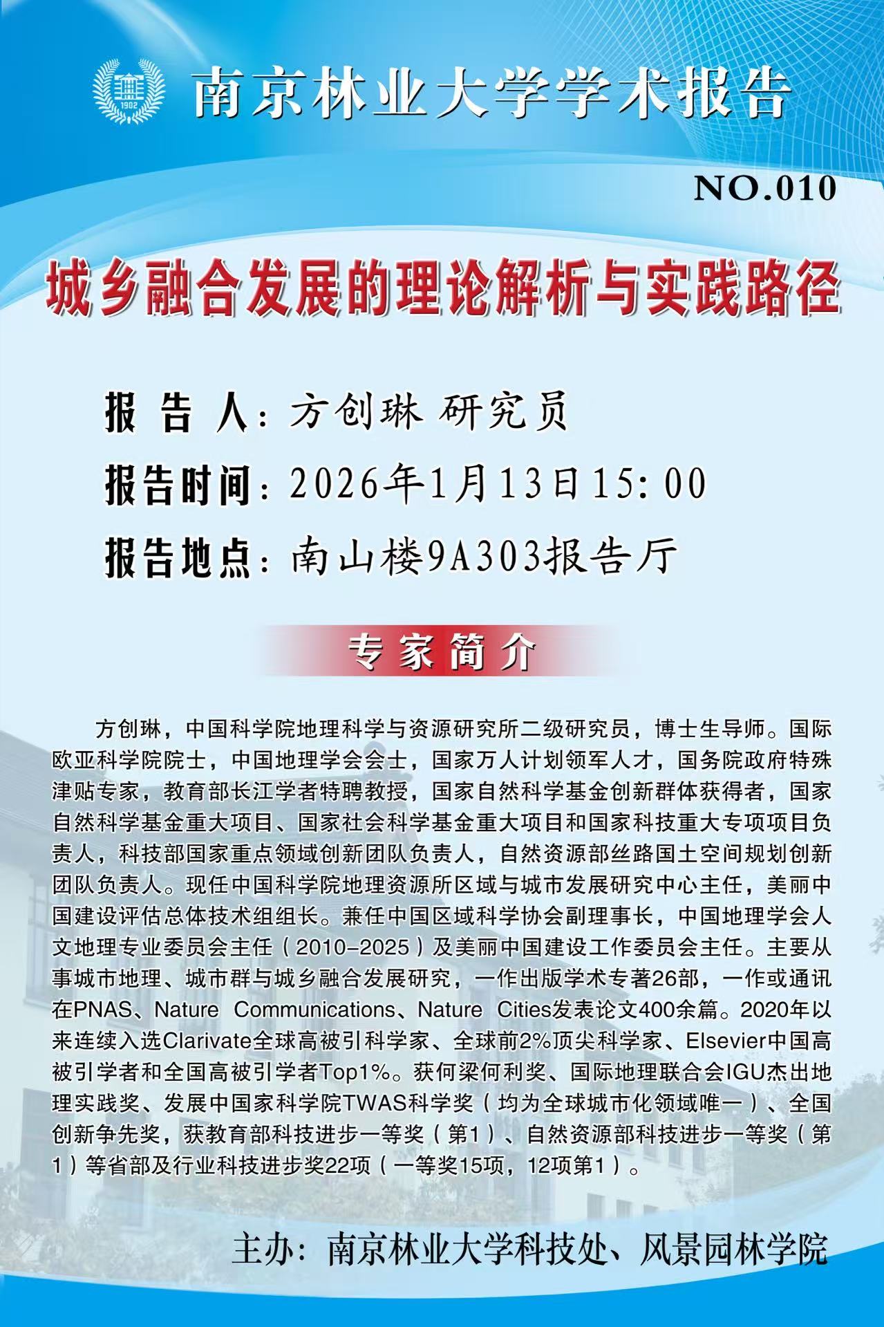 活动预告 首页 -活动预告 城乡融合发展的理论解析与实践路径 来源:通讯员:摄影:【报告人】方创琳 研究员 【报告时间】2026年1月13日15:00 【报告地点】南山楼9A303报告厅编辑:浏览:时间:2026-01-12 字号:【大中小】